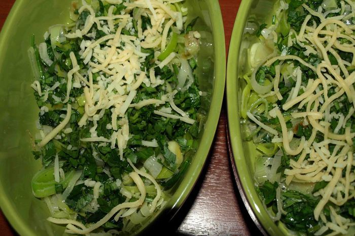 Лук и шпинат раскладываем в жаропрочные формочки. Петрушку мелко рубим, сыр измельчаем на терке. Посыпаем овощи петрушкой и сыром