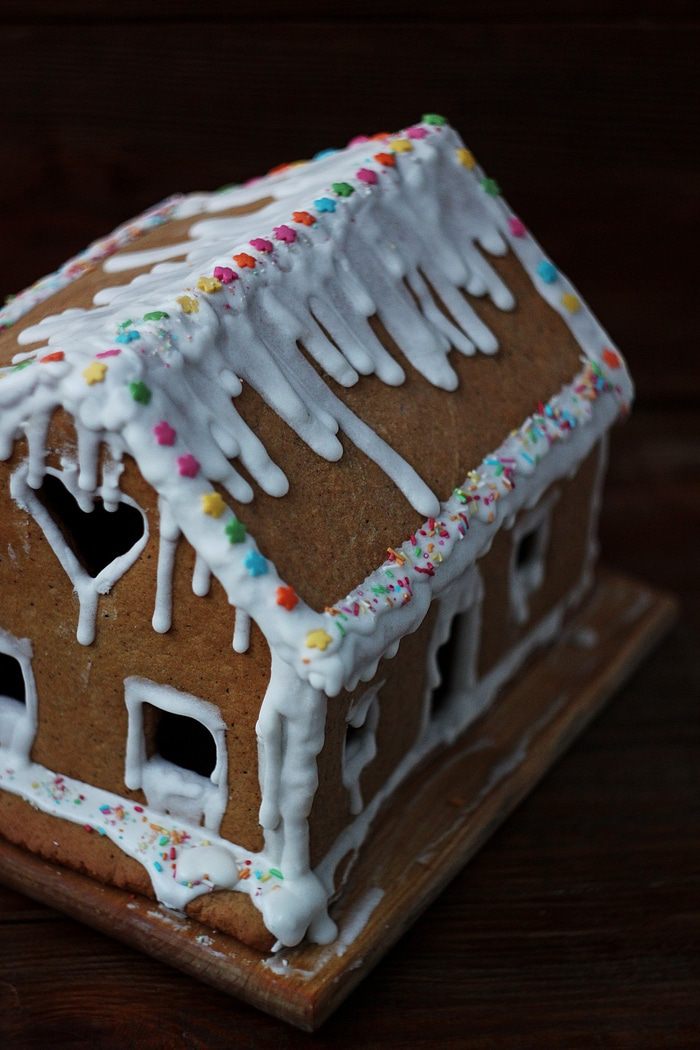 Я готовила его в первый раз и вышел домик слегка неказистый. Надеюсь, у вас получится лучше. Зато тесто идеально — из него получаются отличные «стены» и остается еще и на печенье!