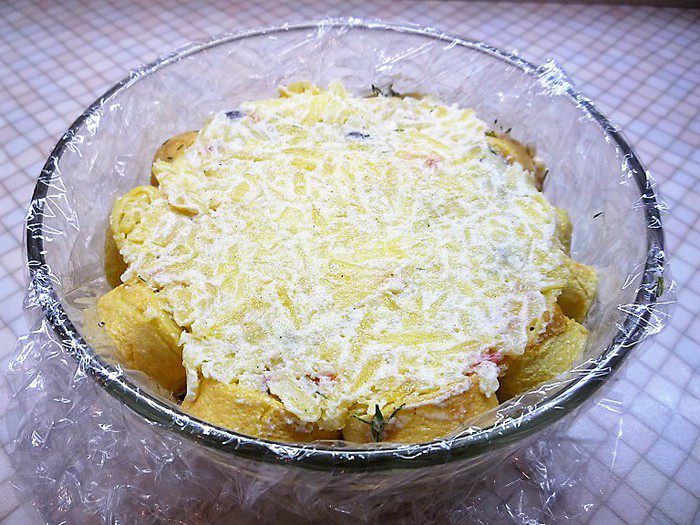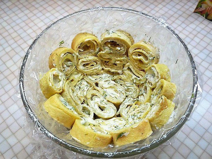 Круглый салатник выстилаем пищевой пленкой, чтобы свисали края. Выкладываем блинные рулетики сначала на дно, потом по бокам.