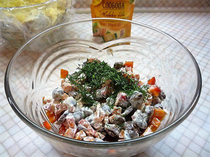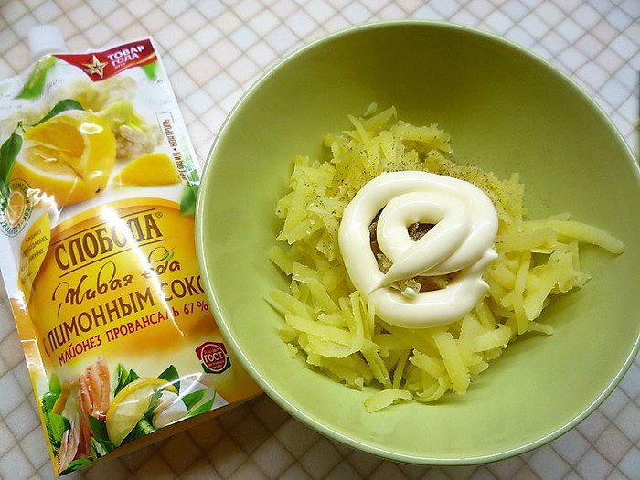 Смешиваем с оставшимся майонезом, добавляем зелень, солим и перчим по вкусу.