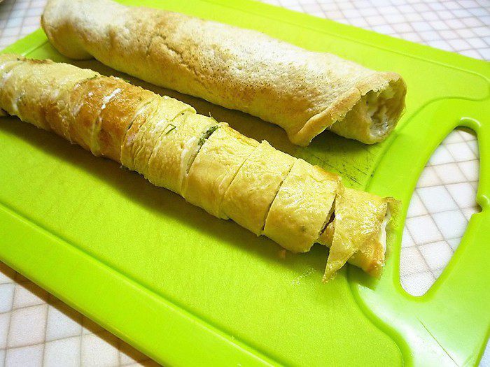 Сворачиваем рулетиками и нарезаем кружочками, толщиной 7 мм.