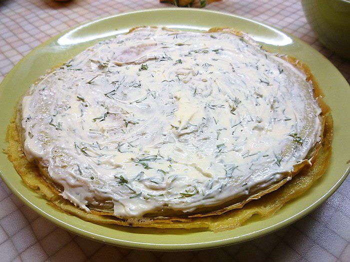 Яичные омлеты смазываем смесью майонеза с зеленью.