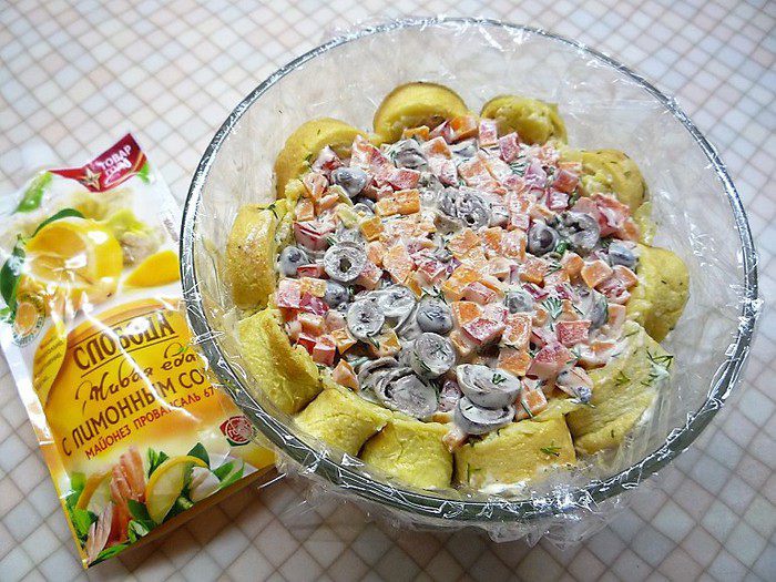 Вкусный, оригинальный по форме, очень сытный салат с красивым названием покорит вас своей простотой и необычным вкусом. Пикантную лимонную нотку салату придаем майонез ТМ «Слобода» с лимонным соком.