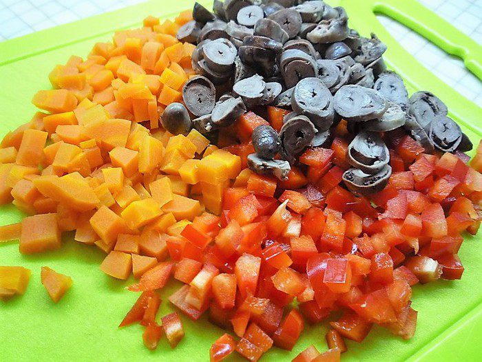 Куриные сердечки, морковь и сладкий перец нарезаем маленькими кубиками.