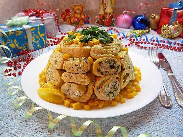 По истечении времени снимаем пленку и переворачиваем салат на плоское блюдо. Украшаем зеленью петрушки и консервированной кукурузой. Подаем на стол. Приятного аппетита.