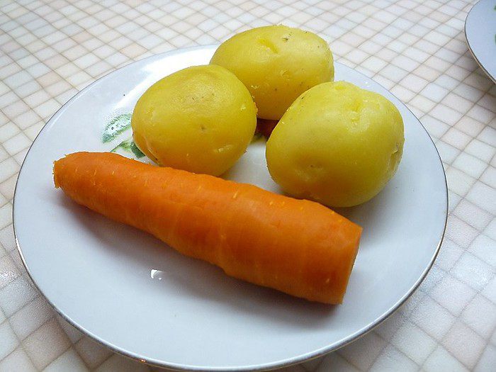 Картофель и морковь отвариваем в подсоленной воде в течении 20 минут и очищаем.