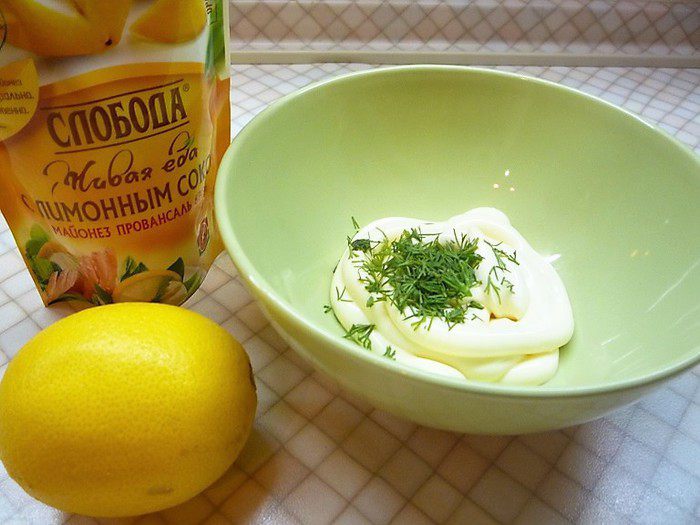 В отдельной чашке смешиваем майонез ТМ «Слобода» с лимонным соком и рубленной зеленью.