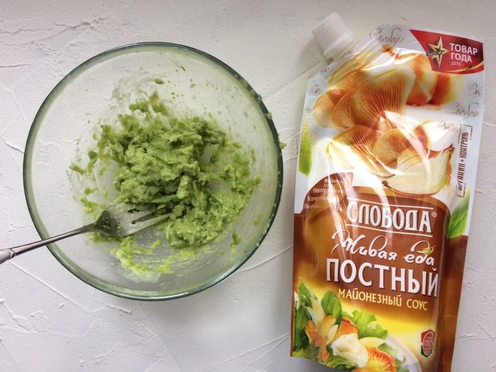 Мякоть извлеките с помощью чайной ложки, затем хорошенько разомните мякоть вилкой, полейте соком лимона и посолите. Добавьте майонез «Слобода» Постный.