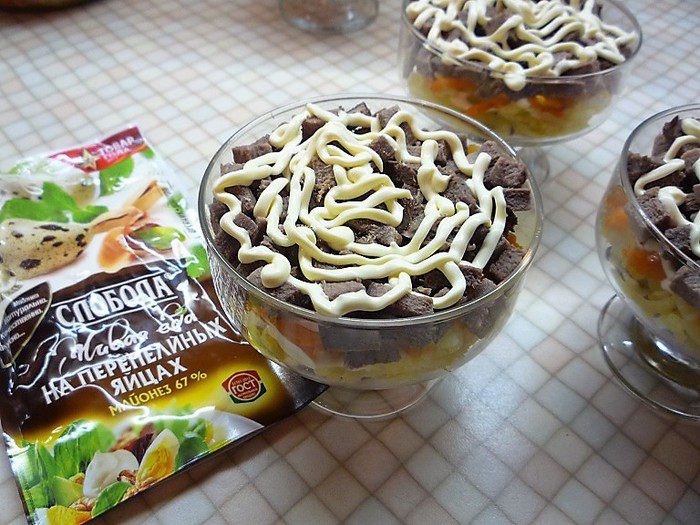 На морковь укладываем нарезанный маленькими кубиками свиной язык, промазываем майонезом.