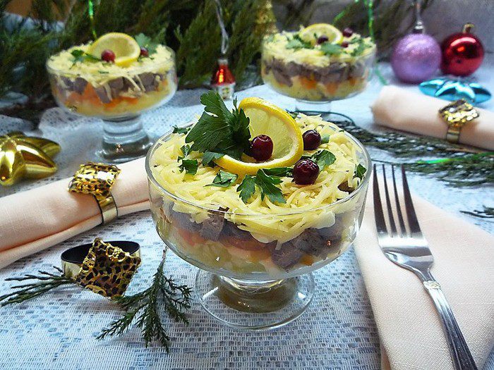 Верх посыпаем сыром, натертым на мелкой терке. Украшаем салат дольками лимона, свежей зеленью и ягодками клюквы. Приятного аппетита! С Новым Годом и Рождеством!