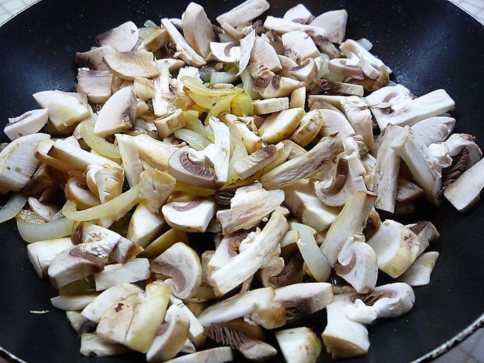 Лук мелко нарезаем и обжариваем в оливковом масле до прозрачности, добавляем нарезанные пластинками шампиньоны, солим, перчим по вкусу, и для пикантности добавляем молотый мускатный орех.