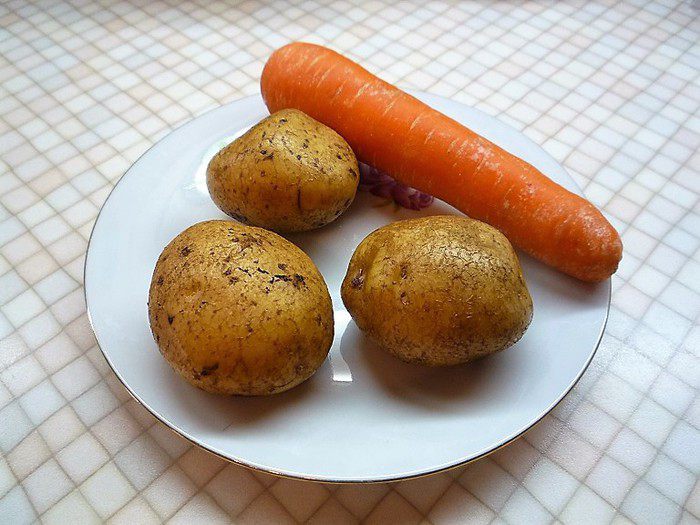 Морковь и картофель отвариваем и очищаем. Свиной язык отвариваем в течении 40 минут, горячим опускаем в холодную воду и очищаем.