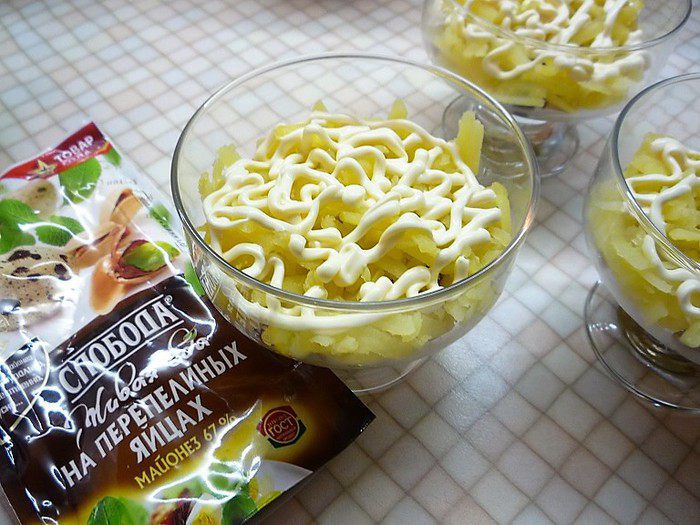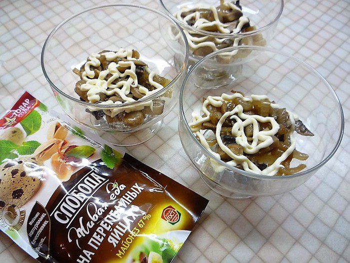 В порционные салатники слоями укладываем: первым слоем — грибы с луком, промазываем майонезом ТМ «Слобода» На перепелиных яйцах.