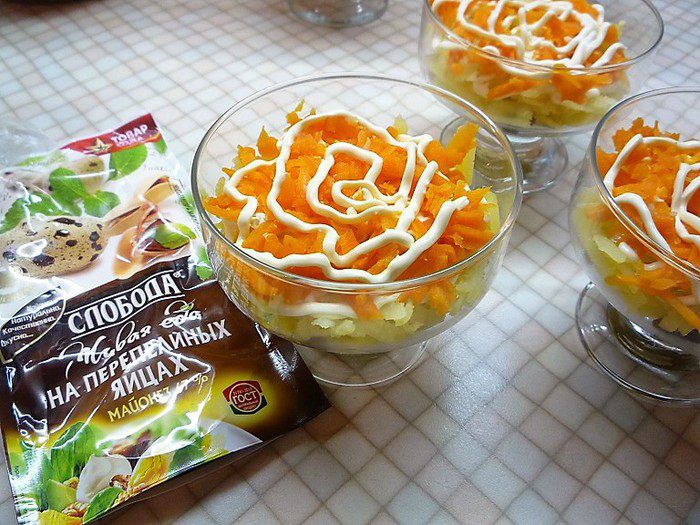 Сверху на картофель укладываем натертую на крупной терке морковь и опять промазываем майонезом.
