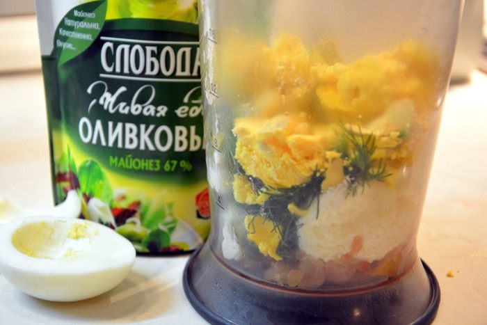 Яйца помыть, отварить вкрутую. Разрезать пополам, вынуть желтки. В чашу блендера сложить: желтки, рыбу, икру мойвы, укроп, огурец, майонез ТМ «Слобода» оливковый, перец. Все перемешать до однородной массы.