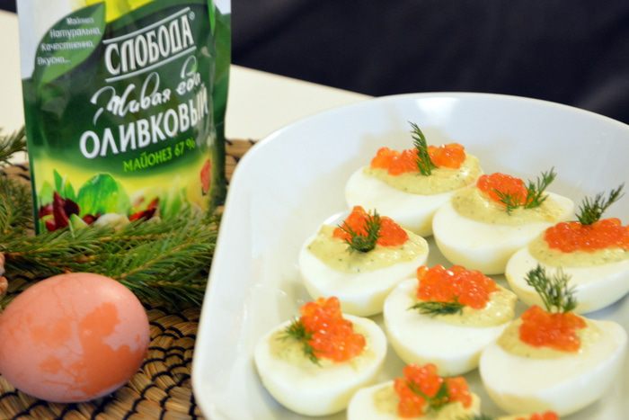 Сверху украсить красной икрой и веточкой укропа. Подавать!