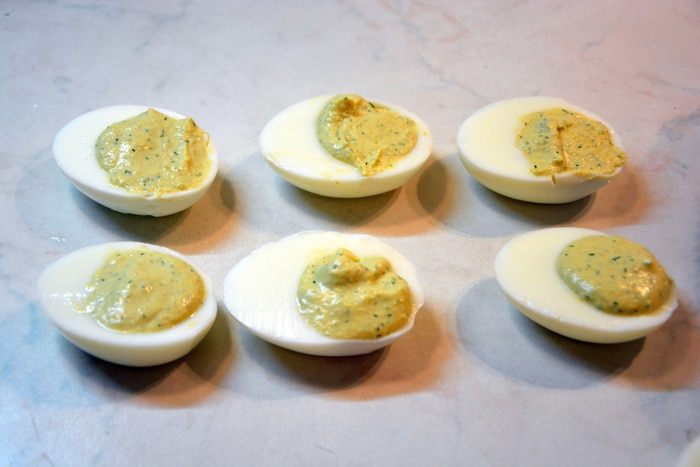 В каждую половинку белка выложить начинку.