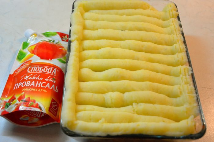 Картофель отварить, слить воду, добавить сливочное масло и молоко. Приготовить пюре. Выложить пюре поверх нашей запеканки. Выпекать при 200°С, 25 минут.