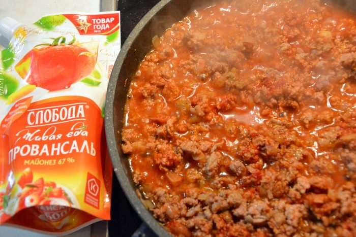 1 луковицу мелко нарезать, обжарить до золотистого цвета. Добавить фарш и жарить 7 минут. Добавить соль, перец, тимьян, томатную пасту и бульон. Перемешать и тушить то загустения соуса.