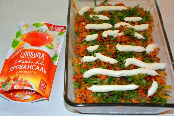 Сверху выложить морковь с луком, зелень и майонез ТМ «Слобода» провансаль.