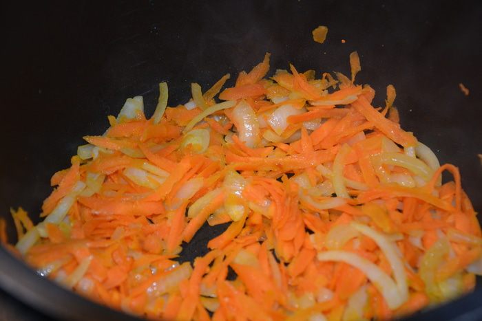 Другую луковицу нарезать мелко, морковь натереть на терке, пассеровать в масле до мягкости.