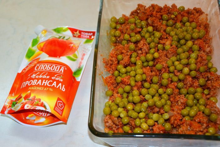 Выложить мясо в форму для запекания, добавить зеленый горошек.