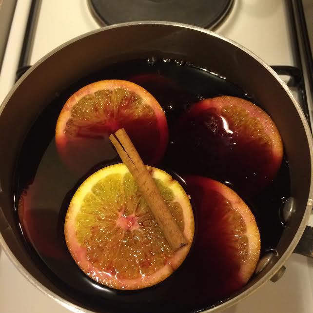 В ковшик налить вино, отвар, добавить сахар, апельсин и поставить на огонь. На медленном огне довести до кипения и снять с огня.