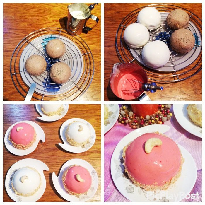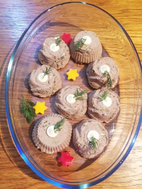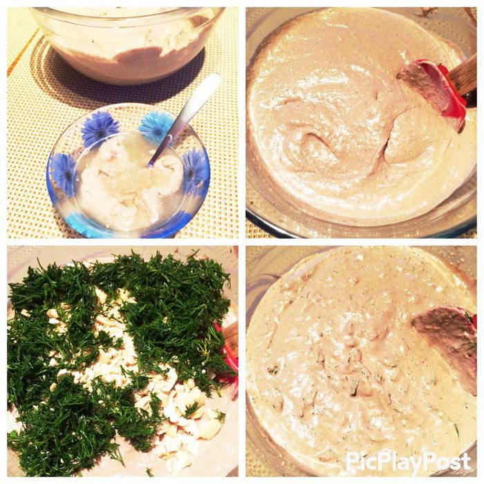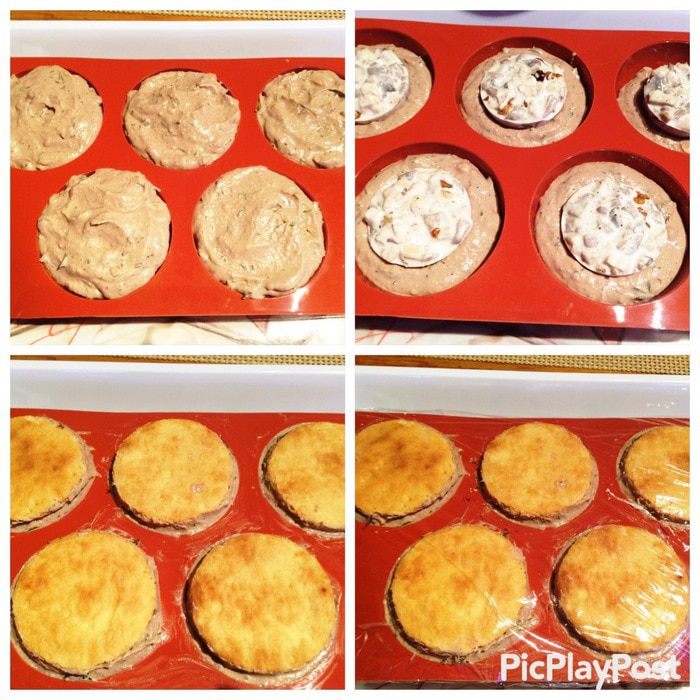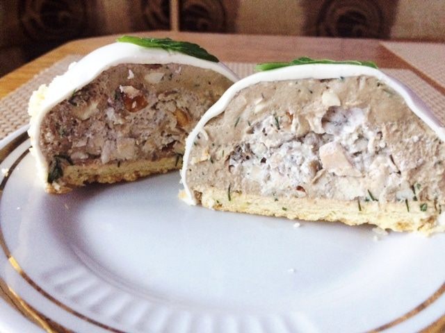 Берем по 2 ложки сметаны и майонеза, смешиваем, солим и перчим. К полученной массе добавляем остывший желатин, перемешиваем. Сметанно-желатиновую смесь добавляем к мясу с грибами и опять все перемешиваем. Раскладываем в силиконовую форму меньшего размера, это будет наша начинка внутри пирожного — сюрприз. Отправляем застывать в холодильник. Я для ускорения процесса отправила в морозилку.