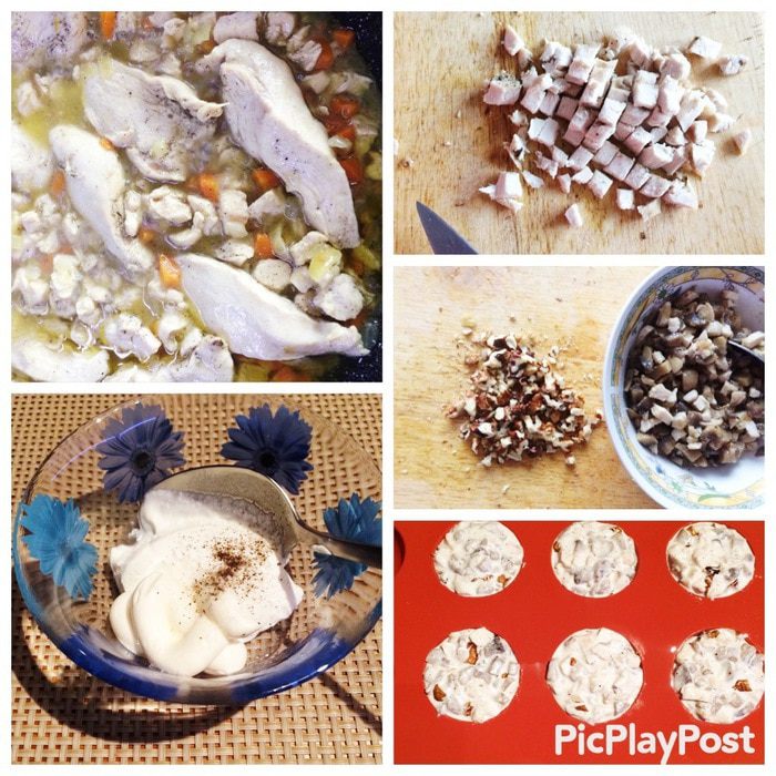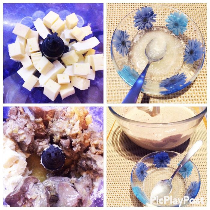 Готовое филе нарезаем кубиком и смешиваем с грибами, добавив горсть рубленых грецких орехов. 1/2 ч. л. желатина заливаем небольшим количеством воды, даем набухнуть минут 5 — 10. Затем нагреваем на водяной бане до полного растворения желатина (не кипятим).