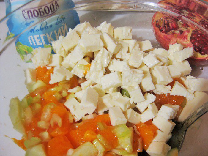 Адыгейский сыр нарезать кубиком, добавить в салат, перемешать.