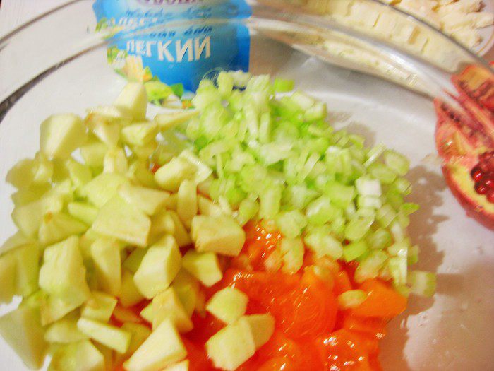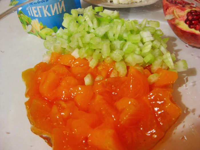 Очистить хурму, нарезать кубиками. Смешать с мелко нарезанным сельдереем.