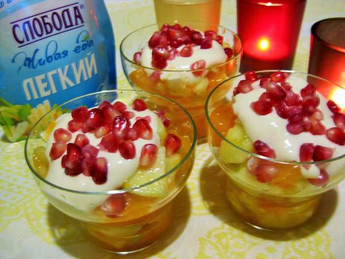 Яркий фруктовый салат — приятное дополнение к праздничному меню. В качестве заправки к этому салату я выбрала майонез Легкий ТМ «Слобода». Он прекрасно сочетается со всеми ингредиентами и не содержит лишних калорий.