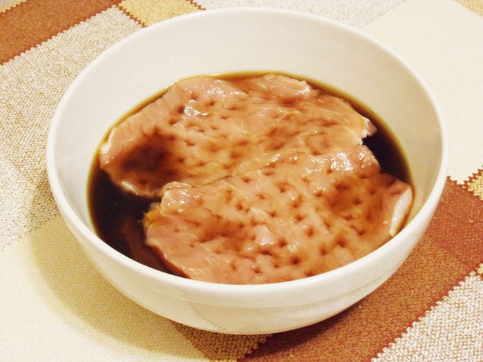 Замариновать в соусе, состоящем из соевого соуса и ананасового сиропа из банки с ананасами. Мариновать примерно 1 час.
