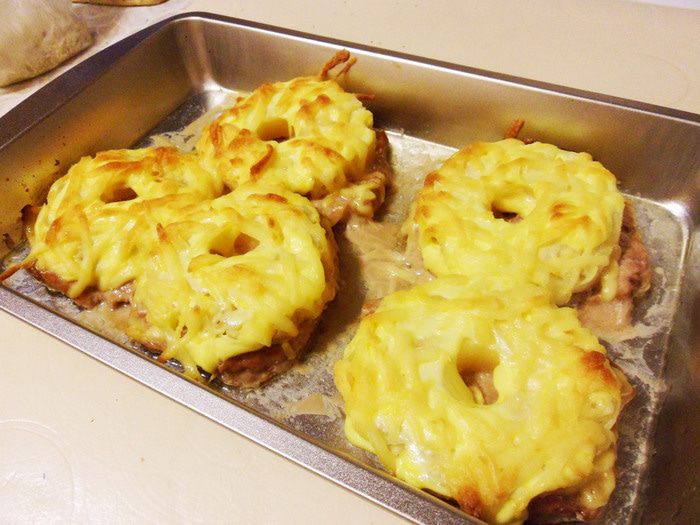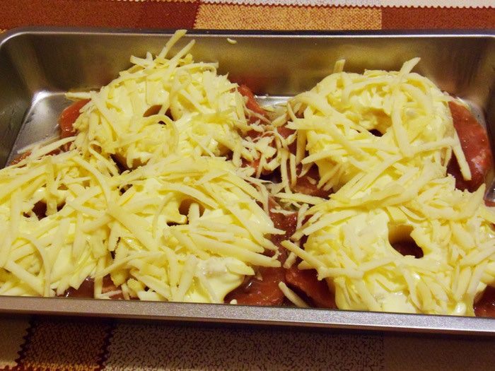 Сыр натереть на крупной терке. Посыпать натертым сыром. Поставить в разогретую до 180°С духовку на 30 — 40 минут.