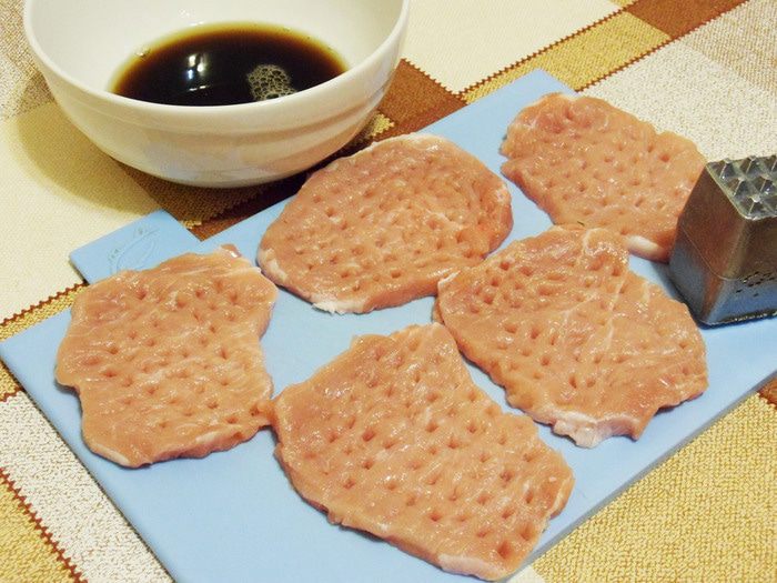 Свинину нарезать порционными кусками по размеру чуть больше, чем кольцо ананаса. Толщина кусочков примерно 1 — 1,5 см. Отбить кухонным молотком. У меня получилось 5 кусочков.