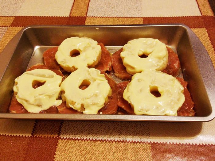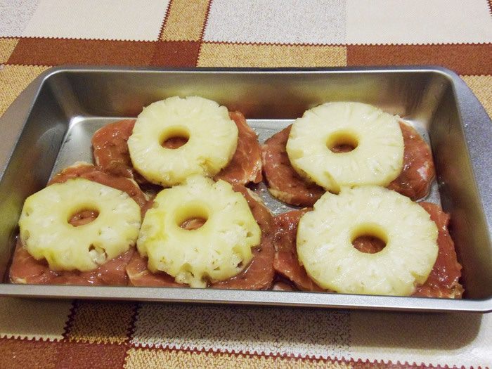 Форму немного смазать маслом. Кусочки свинины выложить в форму. Можно посолить, поперчить по вкусу. Сверху выложить кольца ананасов.