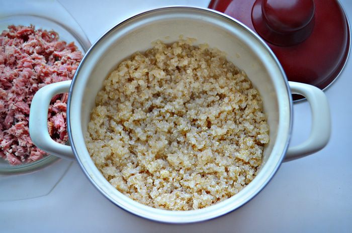 Киноа промойте теплой водой, залейте чистой водой и варите до готовности около 20 минут (после закипания воды немного посолите). После приготовления слейте воду и остудите киноа.