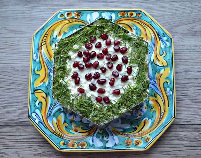 Верх салата украсьте укропом. Можно дополнительно украсить зернами граната или помидорами черри. Салат охладите и дайте настояться в течение 1 — 2 часов.