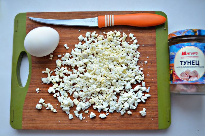 Яйца отварите, охладите и затем мелко порубите.