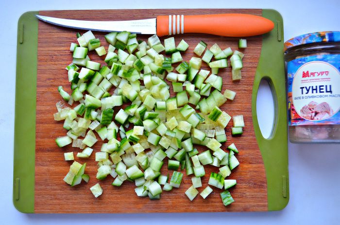 Огурец необходимо помыть, обсушить и нарезать небольшими кубиками.