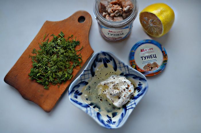 Слейте сок из банки с тунцом, рыбу раскрошите. Укроп промыть, обсушить и мелко порубить. Смешайте все ингредиенты для соуса в отдельной пиале.
