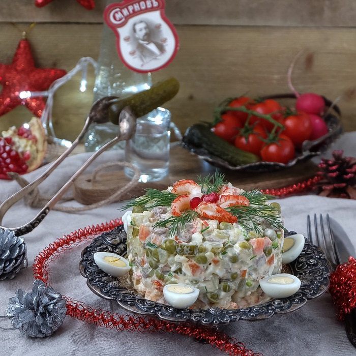 Яйца отварить, мелко порубить. Овощи отварить, почистить, порезать мелким кубиком. Огурцы и телятину также нарезать мелким кубиком. Зеленый лук мелко нарезать. С горошка и раковых шеек слить рассол. Соединить все компоненты вместе, заправить майонезом, перемешать. Украсить по желанию.