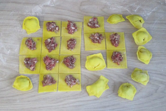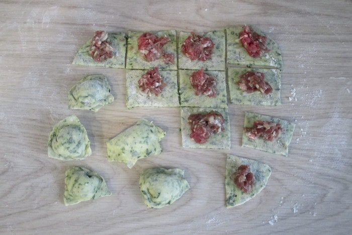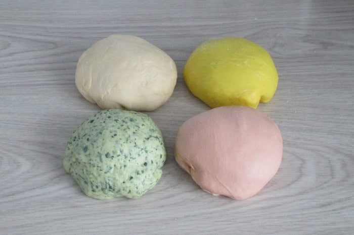 Для красного теста используйте в качестве жидкости просто томатный сок. Для желтого теста перемешайте с мукой порошок куркумы. Для зеленого теста разморозьте шпинат. Не забудьте и про белое тесто — самое обычное.