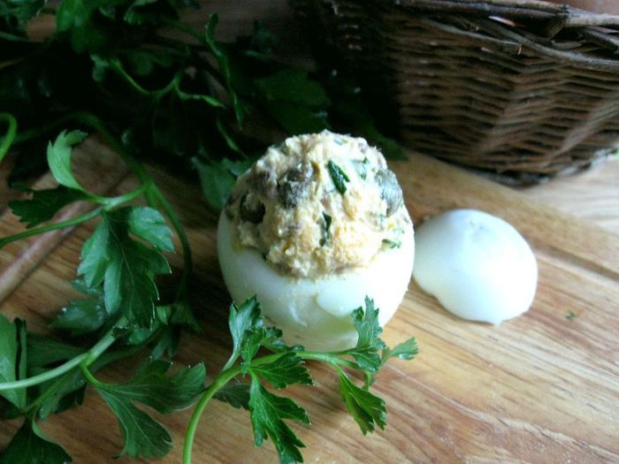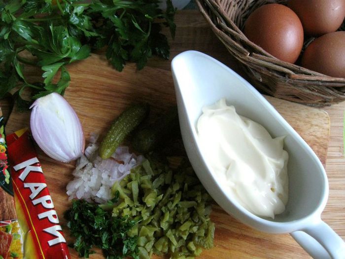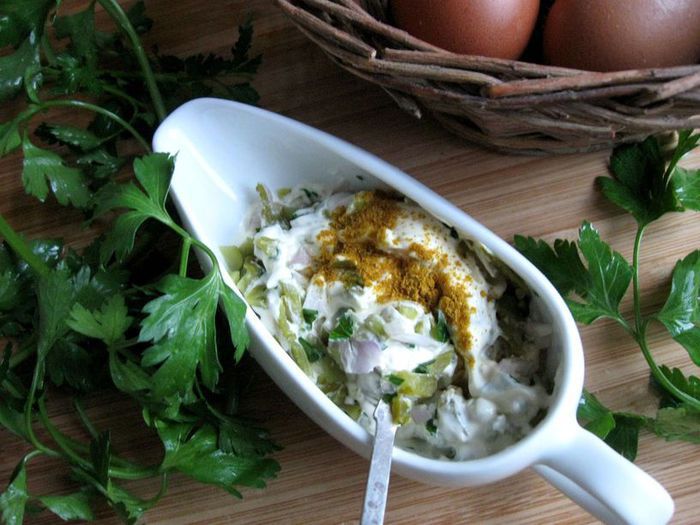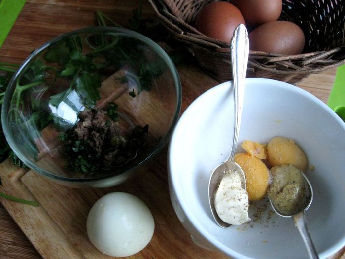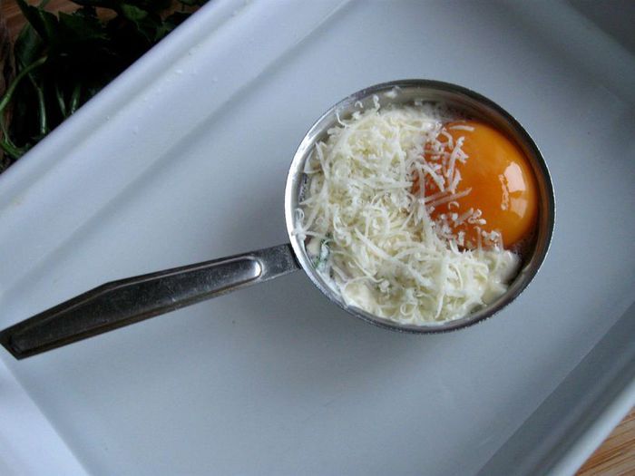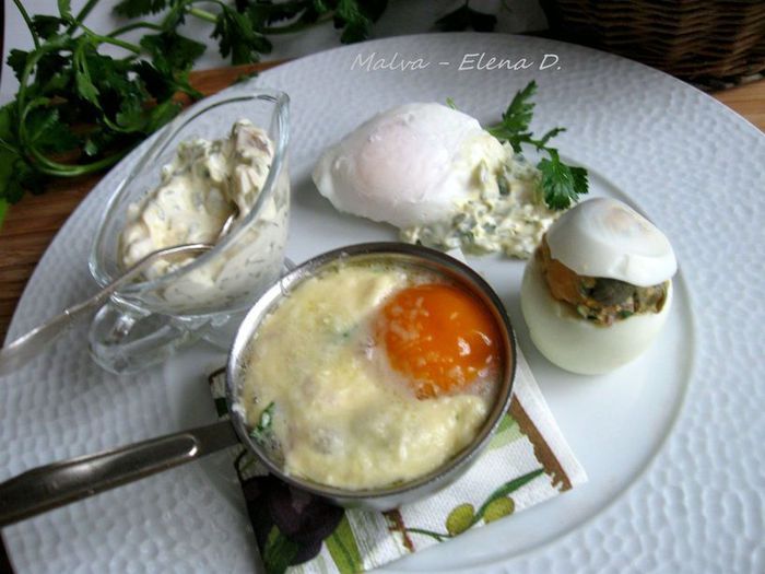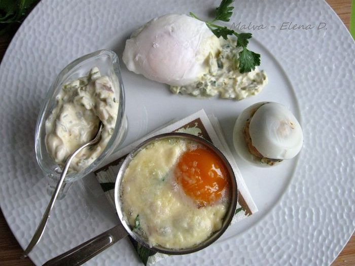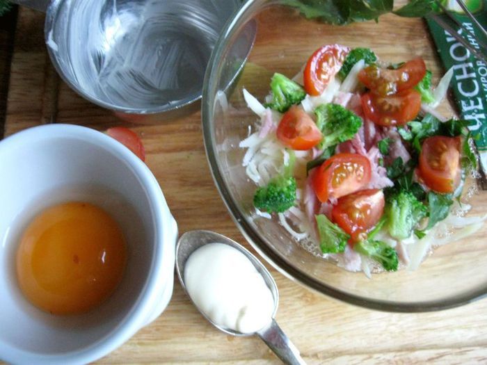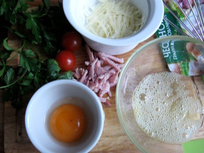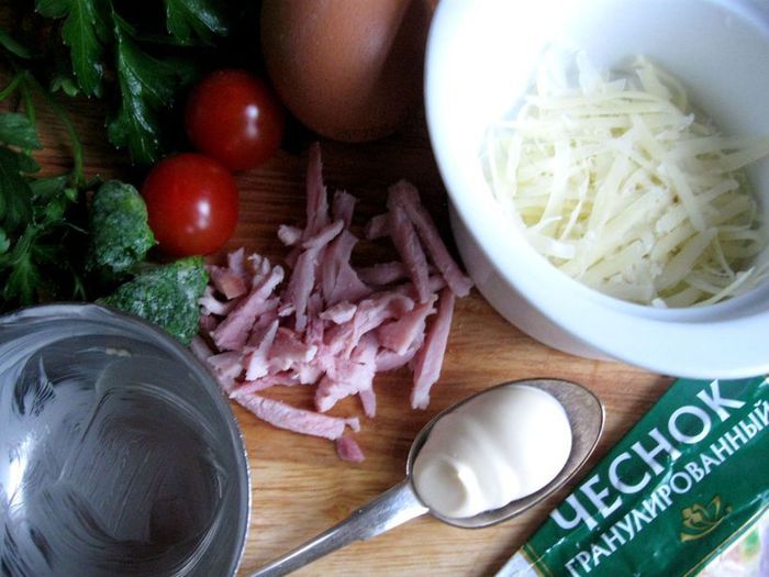 В белок добавить ветчину, сыр, брокколи, измельченную петрушку, нарезанные черри. Посолить, добавить белый перец, сушеный чеснок, перемешать. Выложить в кокотницу, сверху поместить желток, смазать майонезом ТМ «Слобода» Постный. Посыпать сыром, измельченным на мелкой терке.