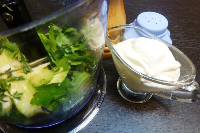 Моем зелень, авокадо, чистим чеснок. У тимьяна оборвем листики со стеблей. С половинки лайма счистим цедру и выдавим сок. В чашу блендера кладем кусочки авокадо, чеснока, крупно нарезанную зелень петрушки, листья тимьяна, цедру и сок лайма, сметану.