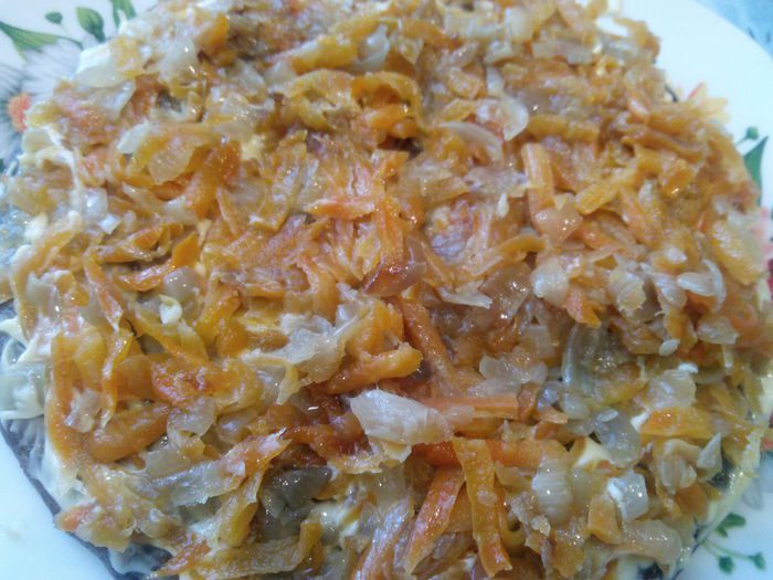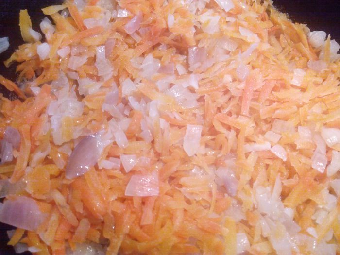 Морковь натереть на крупной терке, лук нарезать кубиками. Обжарить на масле до мягкости. Откинуть овощи на дуршлаг, чтобы стекло лишнее масло.