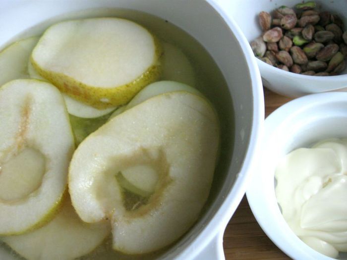 Лимонный сок разбавить водой. Опустить колечки яблока и груш в жидкость. Фисташки очистить.