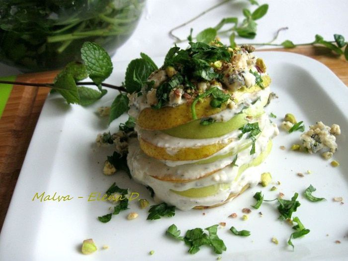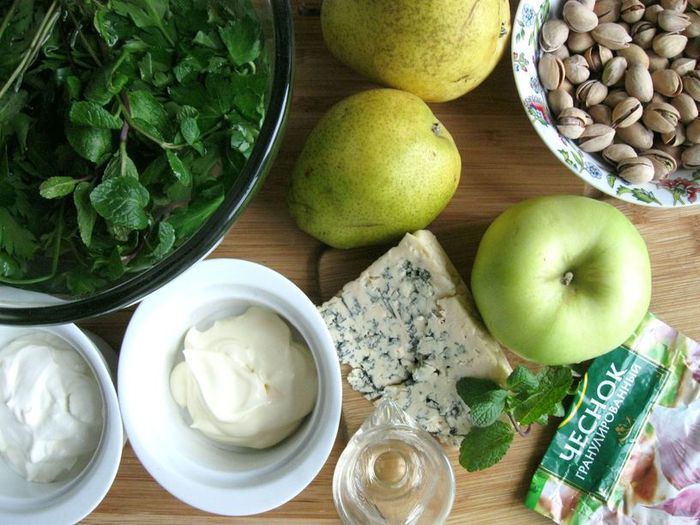 Предлагаю попробовать фруктовый салат, соус здесь пикантный, на мой вкус, идеальный для подобных салатов. Для его приготовления использовала сыр из коровьего молока с голубой плесенью и майонез ТМ «Слобода» легкий. Фисташки, зелень дополняют вкус блюда.