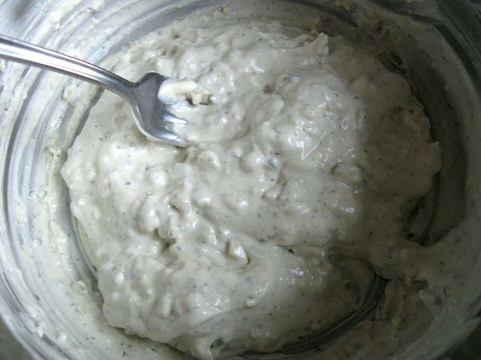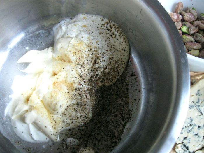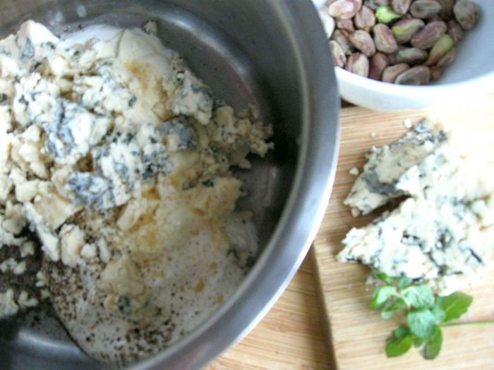 Добавить к соусу часть сыра с плесенью (чуть больше половины от общего количества).