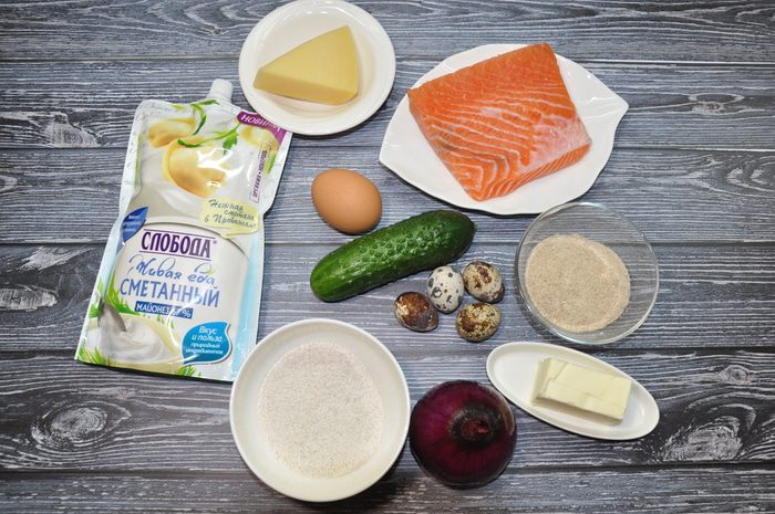 Огурец и семгу нарежьте средними кубиками, лук покрошите очень мелко, а пармезан натрите на мелкой терке.